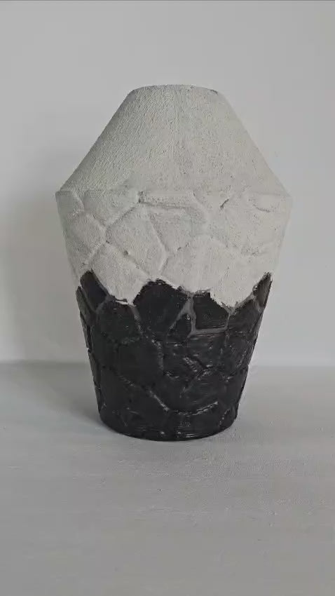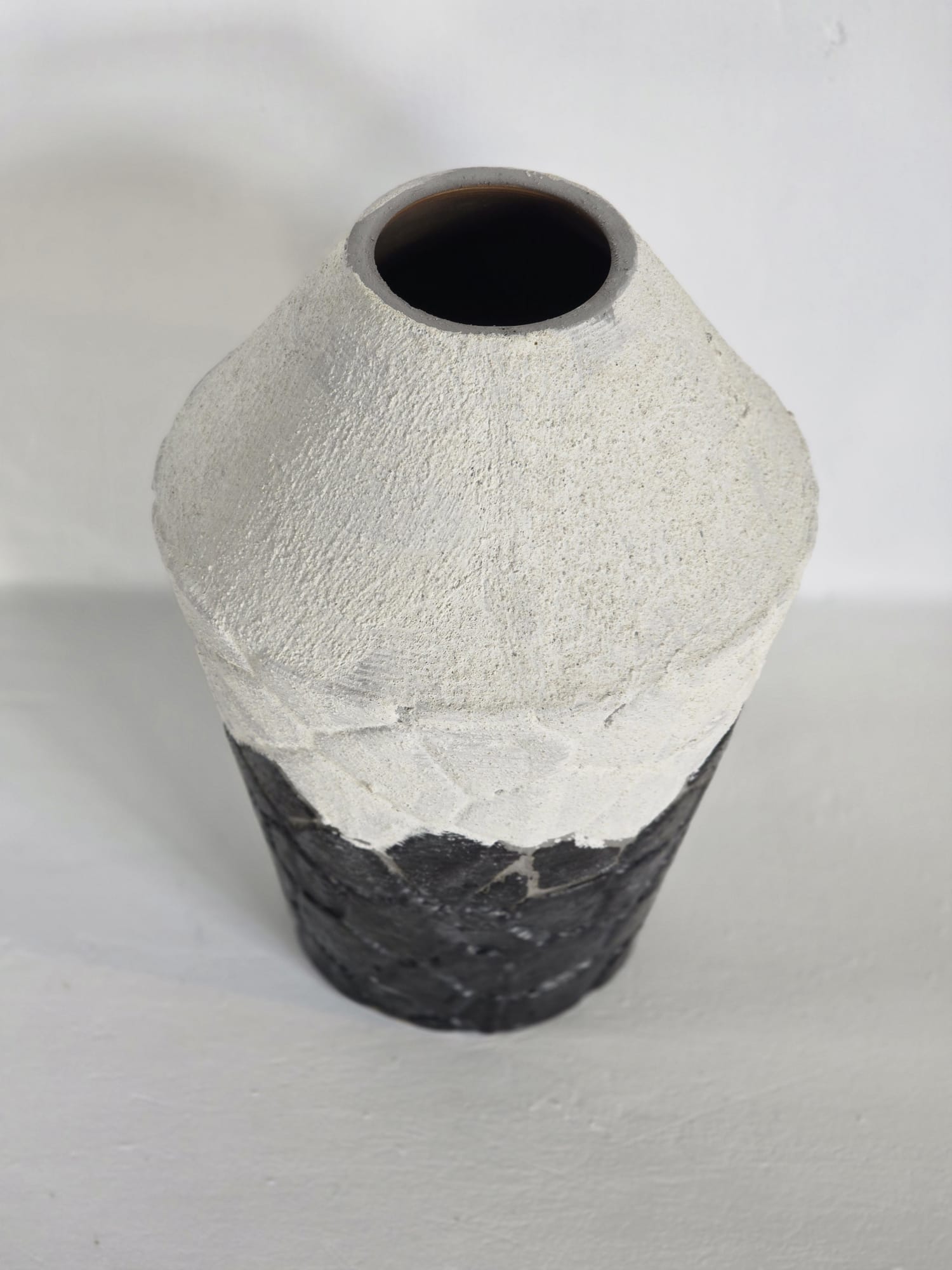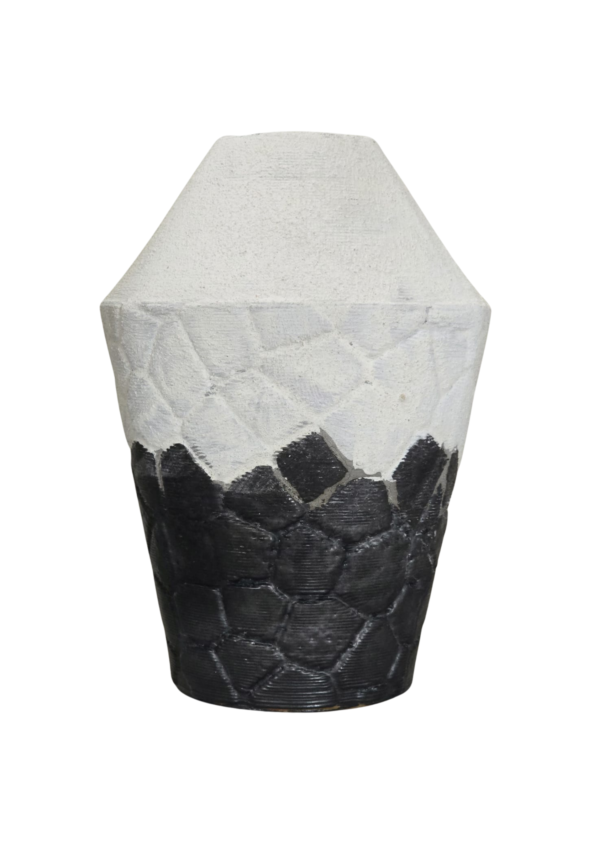 O piesă ceramică unicat cu profil ascuțit și volum geometric controlat, inspirată de ritmurile materiale ale reliefului digital. Partea superioară este acoperită cu tencuială decorativă, întărită cu rășină, care captează lumina mat și mineral. Partea inferioară, tratată cu o glazură metalică pe bază de cupru, oferă reflexii adânci și întunecate.