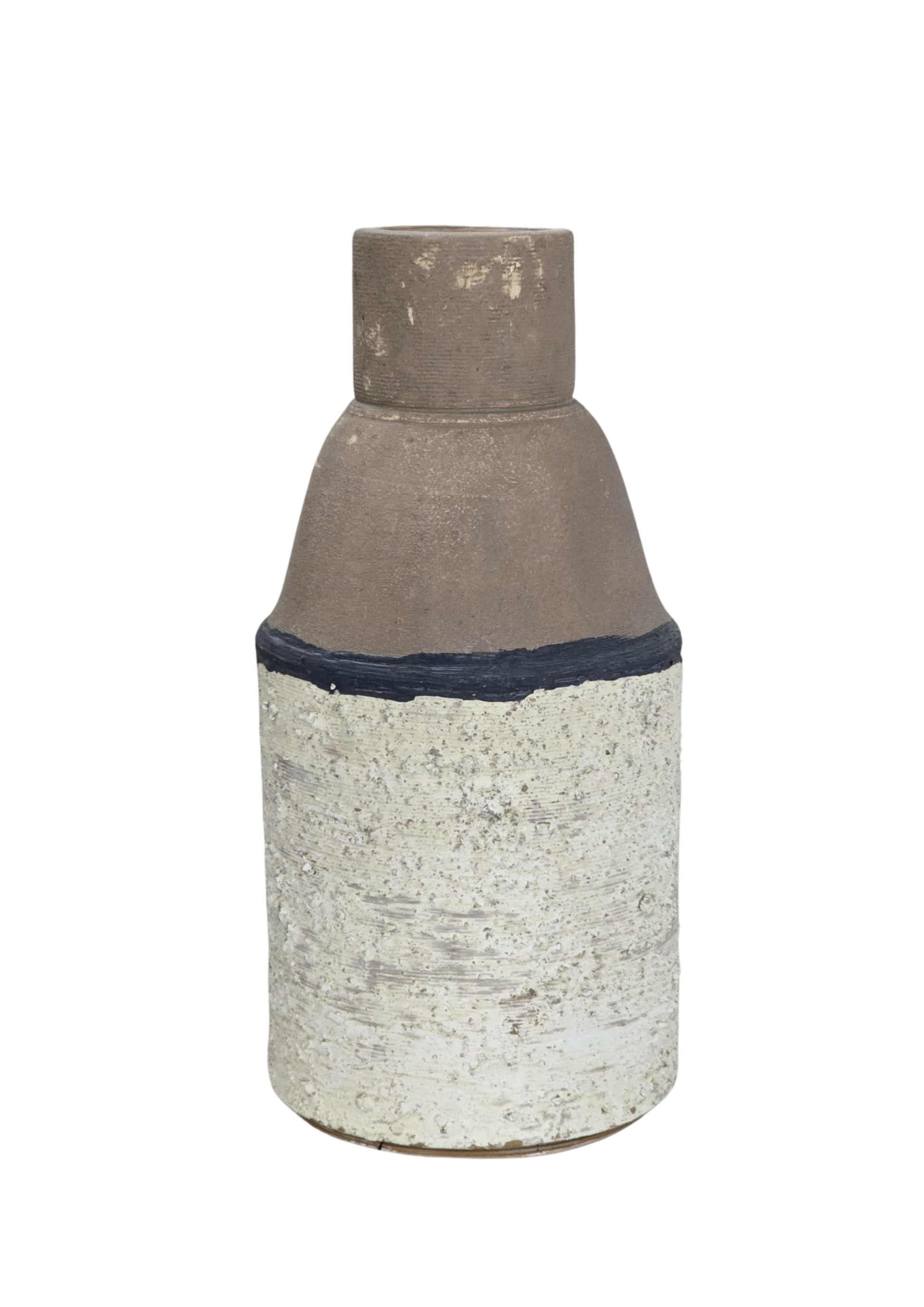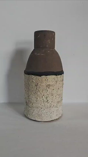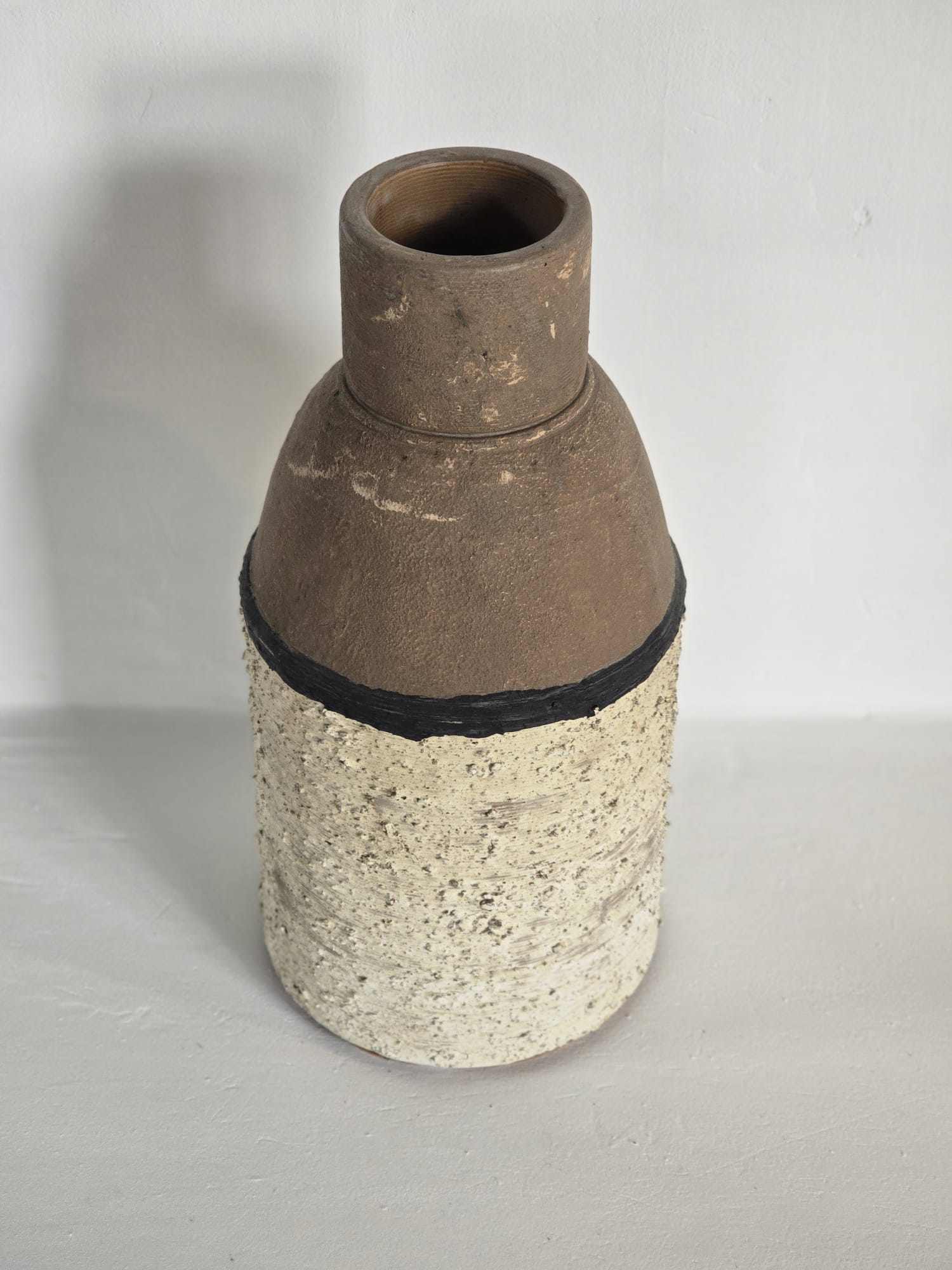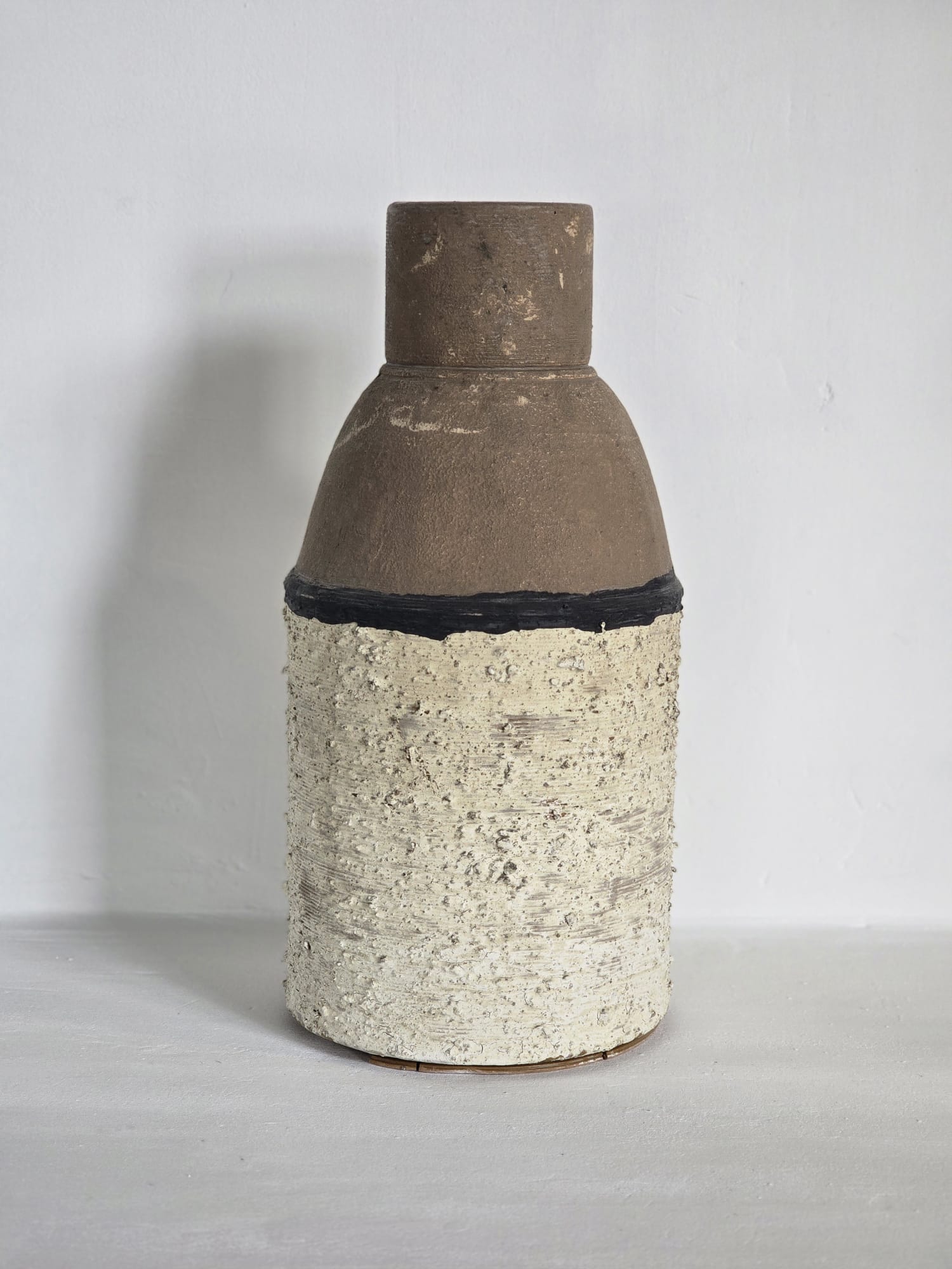 O piesă sculpturală unicat, realizată prin imprimare 3D din lut roșu. Volumetria alungită este accentuată de o zonă conică abruptă, urmată de un segment geometric. Finisajul exterior combină lut alb cu cenușă zburătoare și un accent grafic de lut negru. Interiorul este acoperit cu glazură transparentă mată. Un obiect de forță estetică, dedicat interioarelor unde imperfecțiunea devine rafinament.