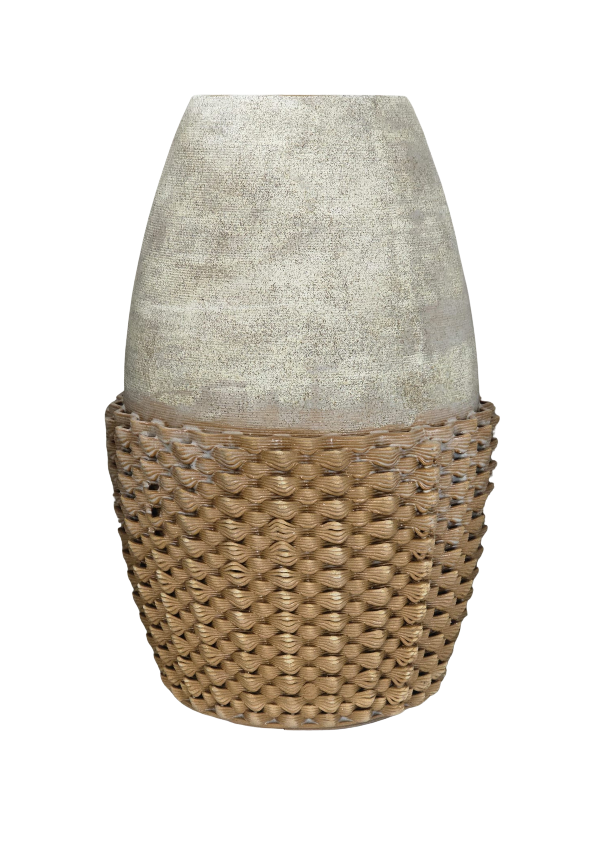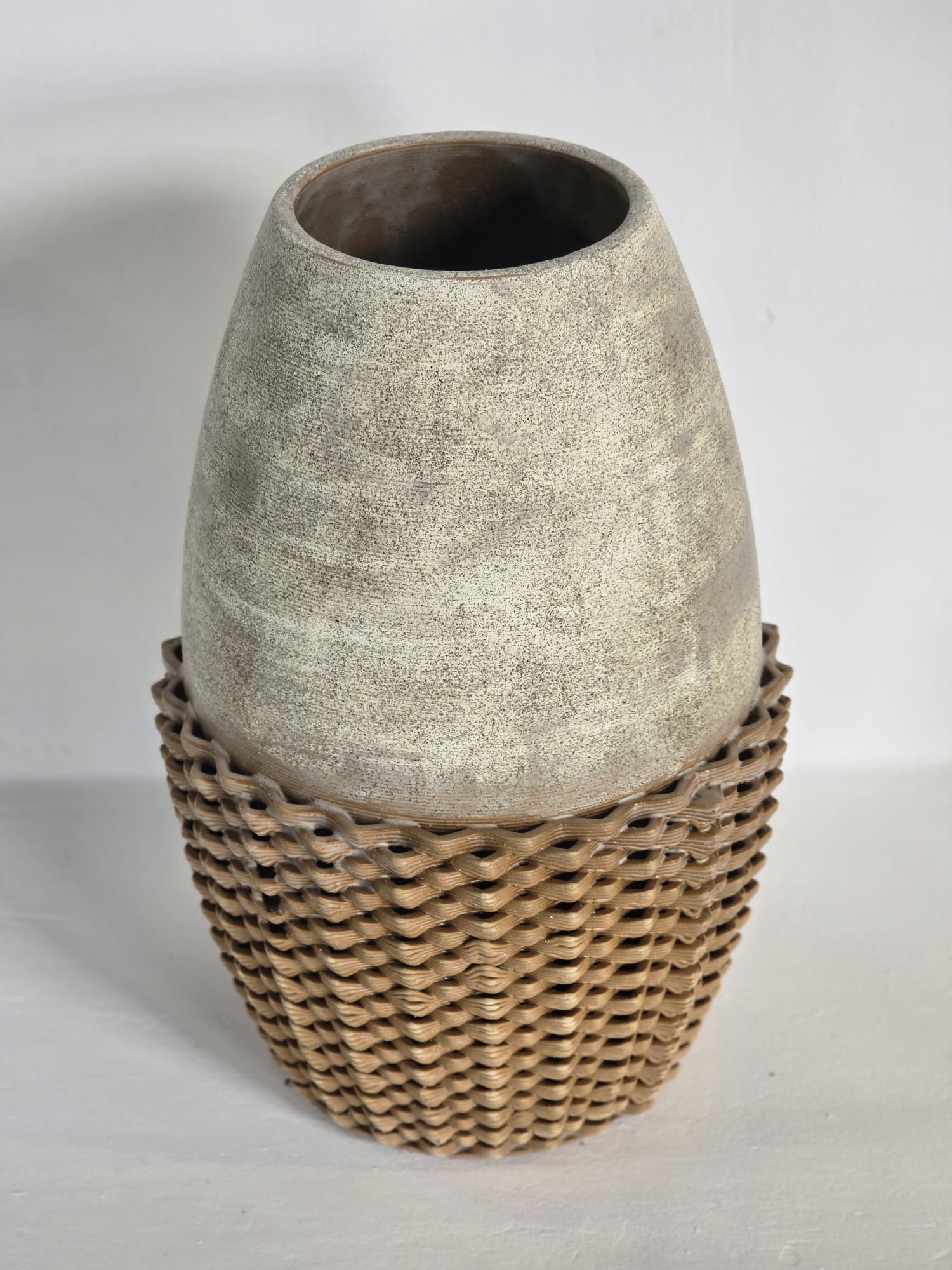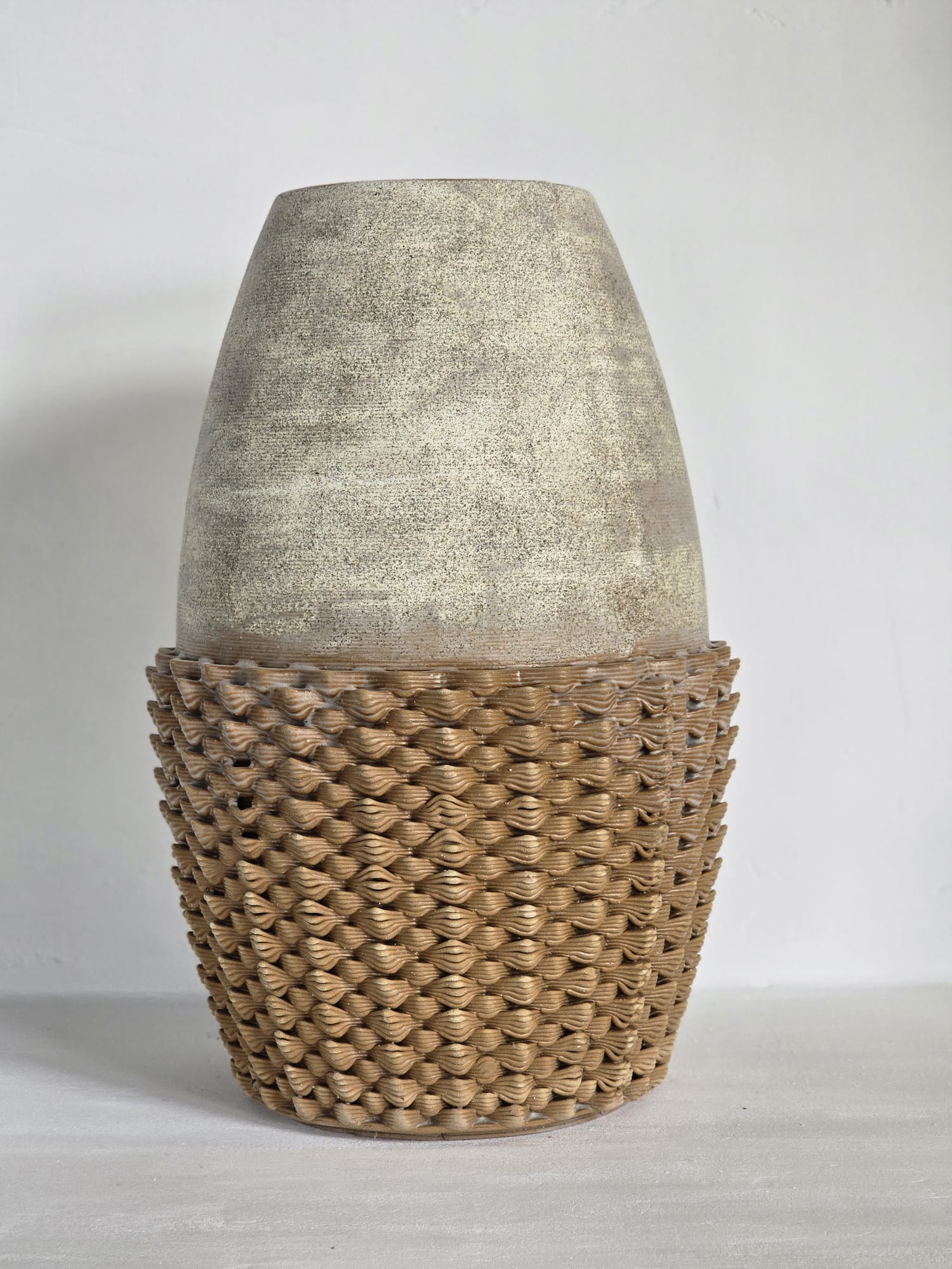 O piesă sculpturală de dimensiuni mari, creată din lut roșu imprimat 3D, cu o bază texturată în rețea și un finisaj superior acoperit parțial cu o glazură experimentală pe bază de lut alb și nisip vulcanic din Tenerife. Interiorul este glazurat cu un strat mat transparent, ceea ce o face perfectă și pentru utilizare funcțională.