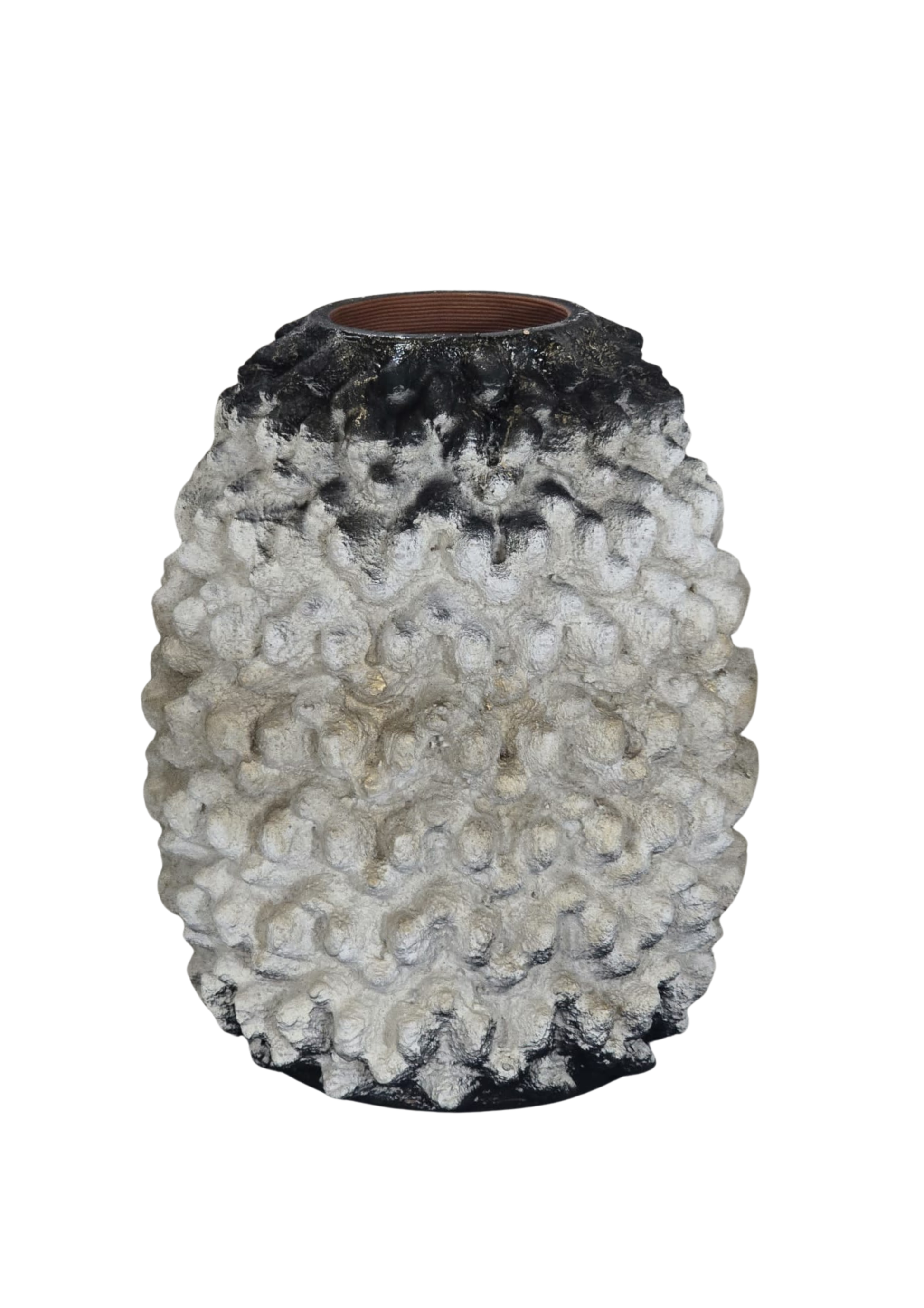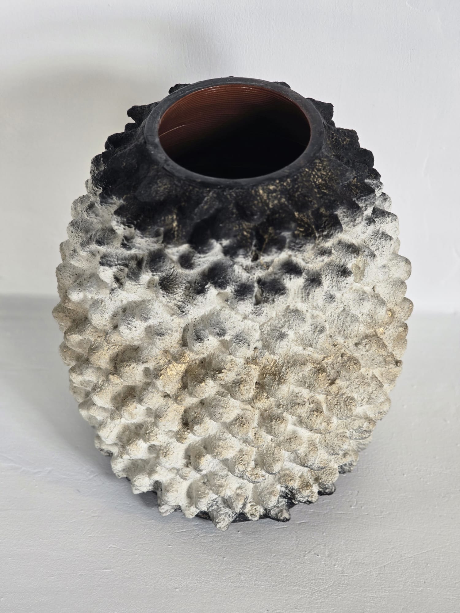 Această piesă din seria „Textura Focului” explorează tensiunea dintre suprafață și adâncime, dintre materie brută și finisaj industrial. Volumul este definit de o textură densă, imprimată 3D, care evocă structuri geologice erodate, dar care prinde viață prin contrastul cu luciul stratului final de rășină.