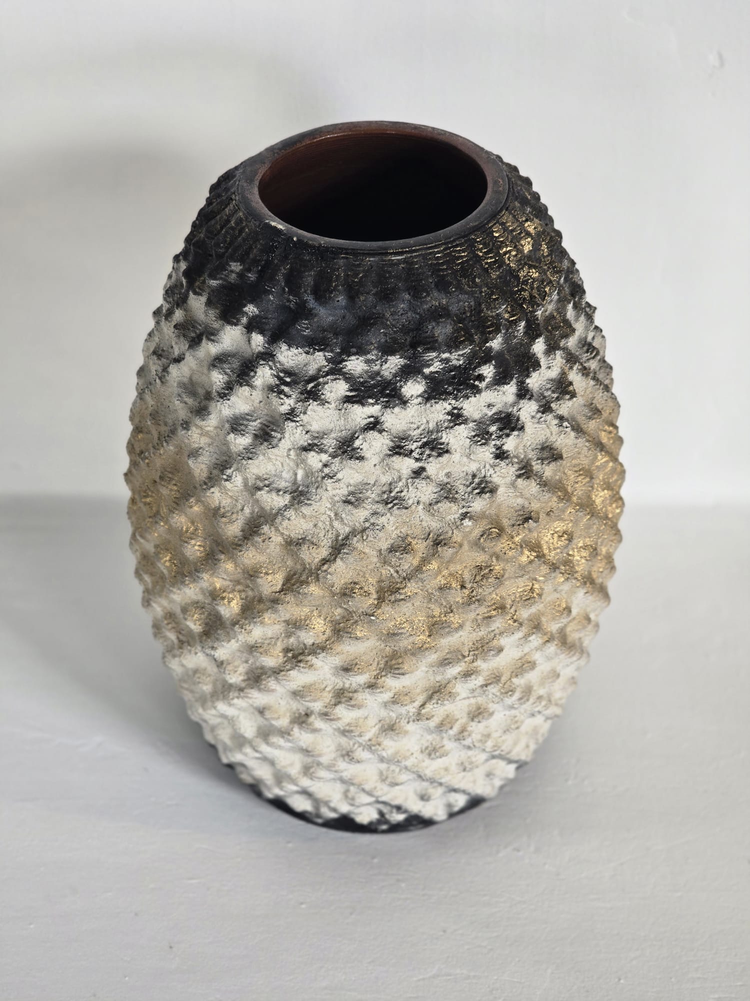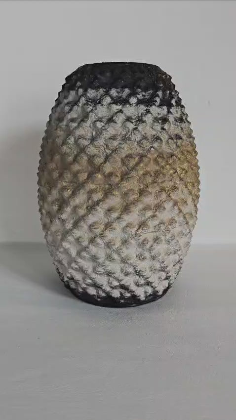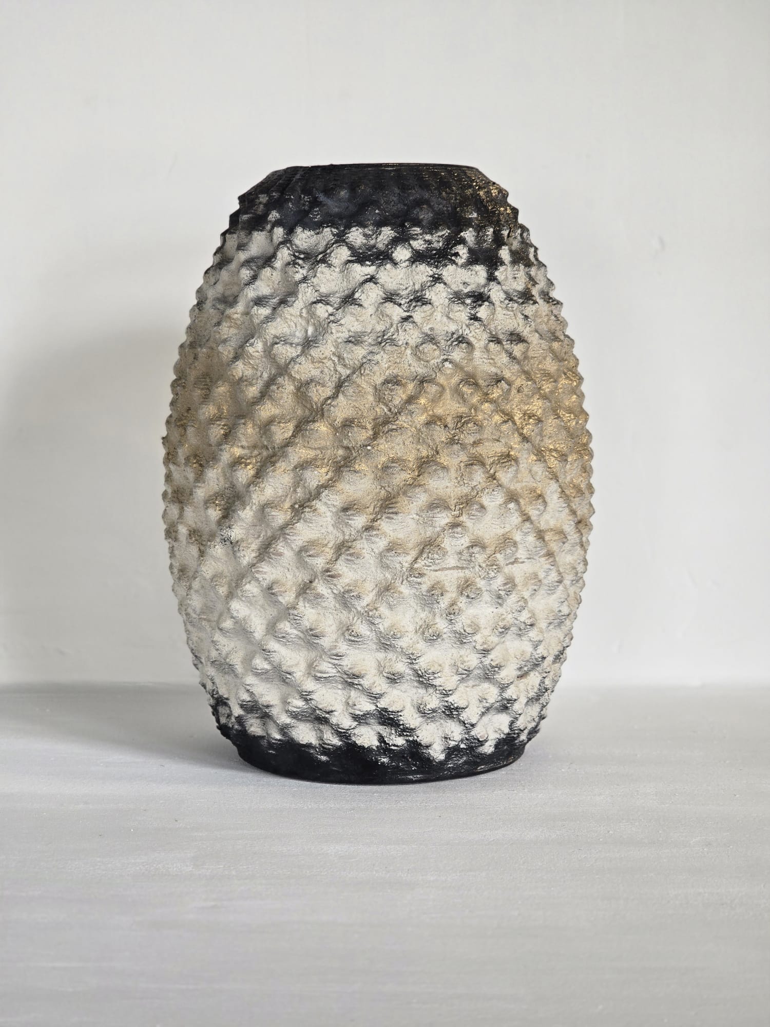 Volumul acestei piese accentuează verticalitatea, aducând o prezență puternică în orice spațiu. Textura imprimată 3D pare că a fost modelată de lavă răcită, iar vopseaua metalică degradată accentuează efectul de stratificare organică.