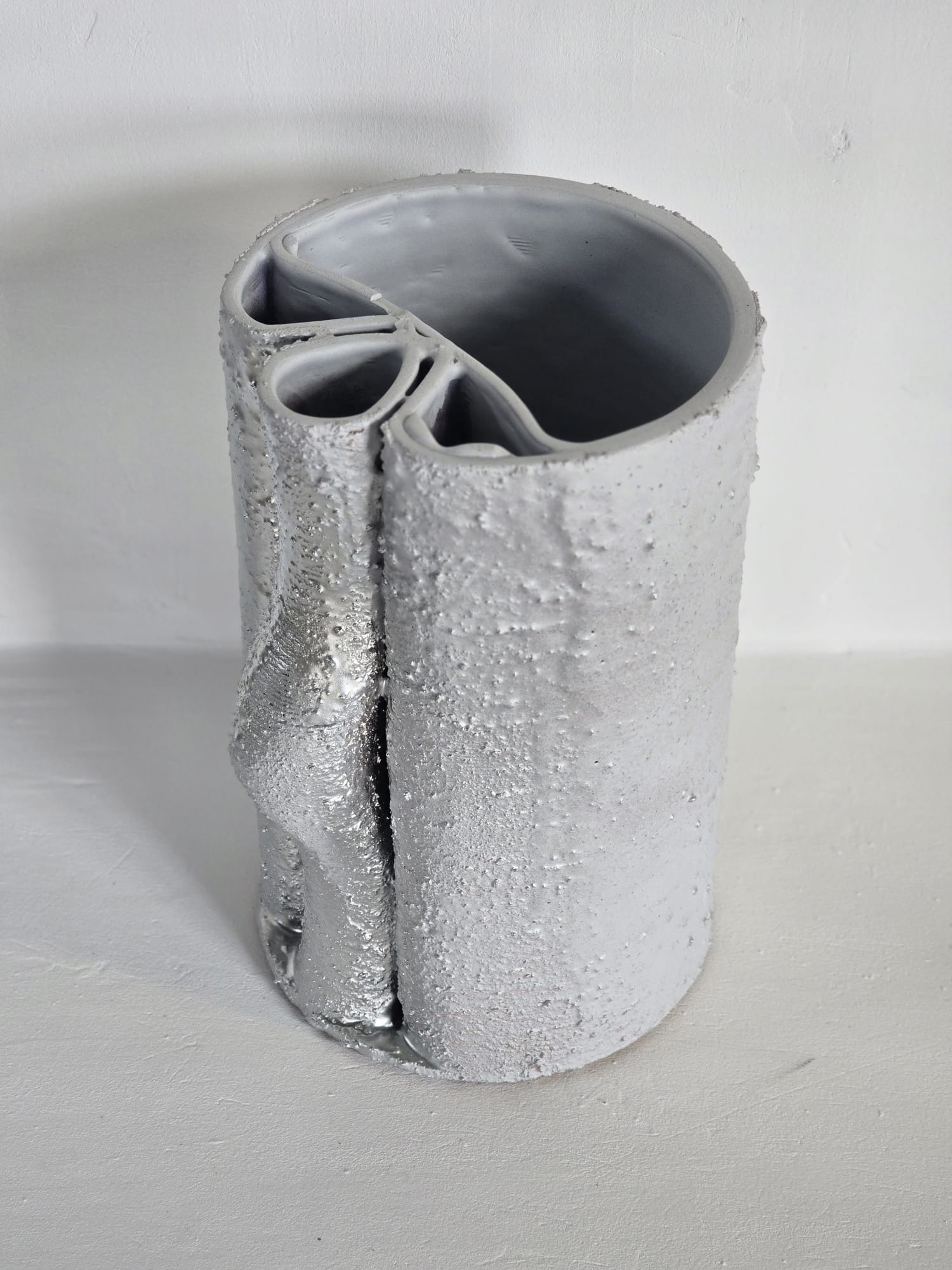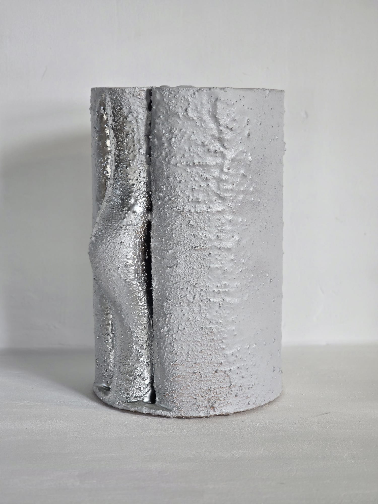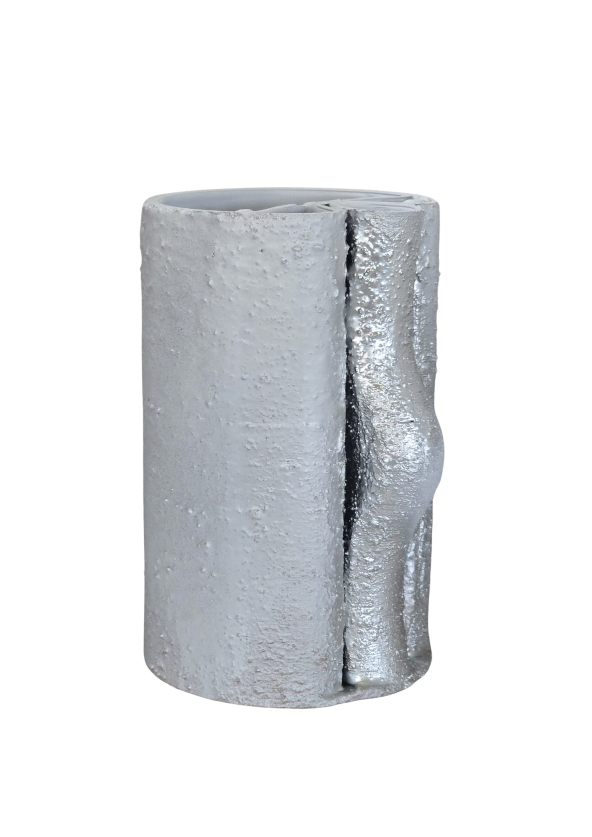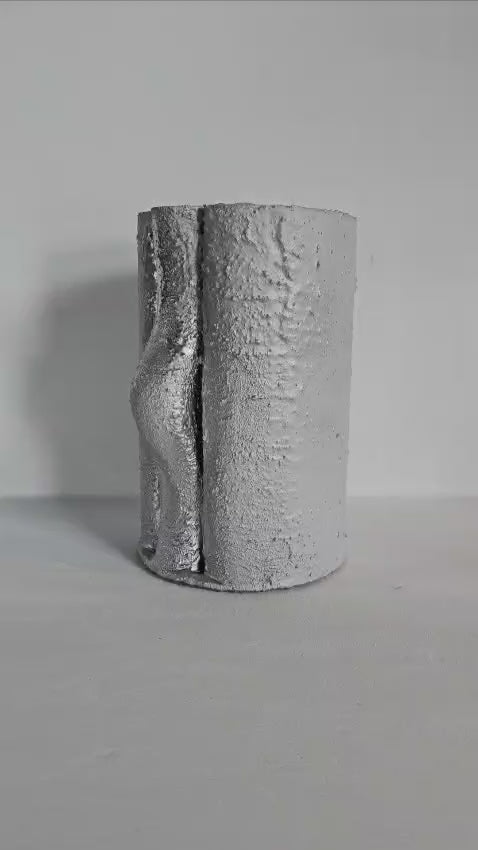 Obiect decorativ cu o formă cilindrică aparent rigidă, spartă de un singur gest sculptural lateral — o inflexiune care rupe simetria. Suprafața este acoperită cu glazură albă experimentală în care au fost încorporate resturi ceramice, apoi pigmentată cu accente metalice discrete. Este o piesă reflexivă, cu o forță tăcută, ideală pentru spații austere sau colecții de obiecte rare.
